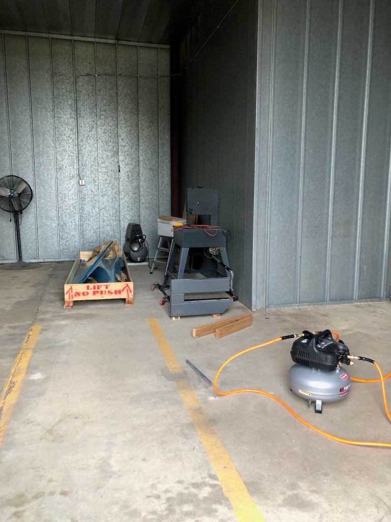 Tom assembled a crew to move everything. He and a couple of former mock trial kids loaded the crate and the giant air compressor into his truck and off we went. It cost me burgers and milkshakes. They believe they were overpaid. I love these kids.